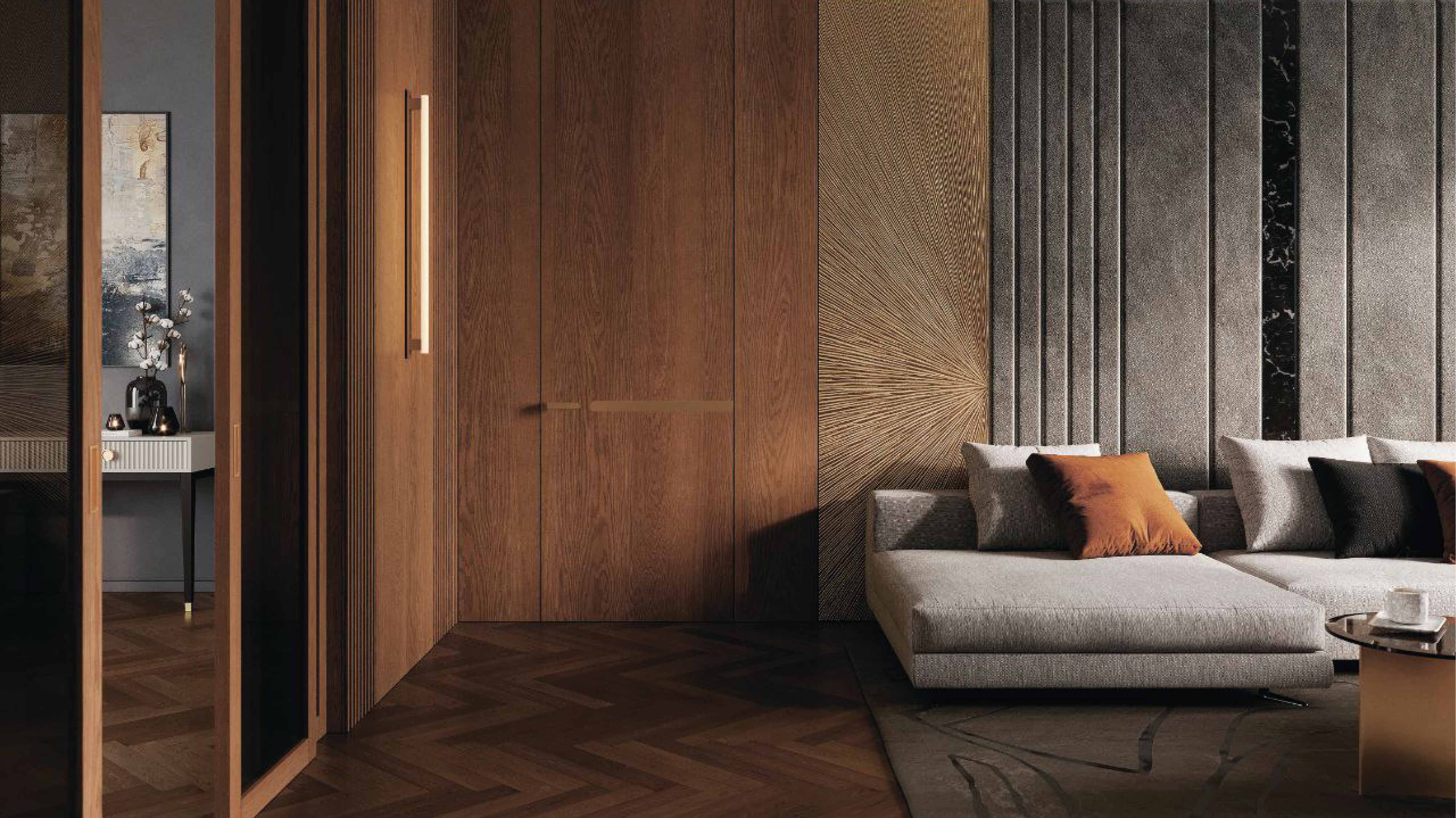 Чистые линии, строгие формы и изысканные золотые металлические вставки создают яркий, но ненавязчивый акцент в интерьере. Такие двери выглядят сдержанно, но при этом притягивают внимание стильными деталями.
