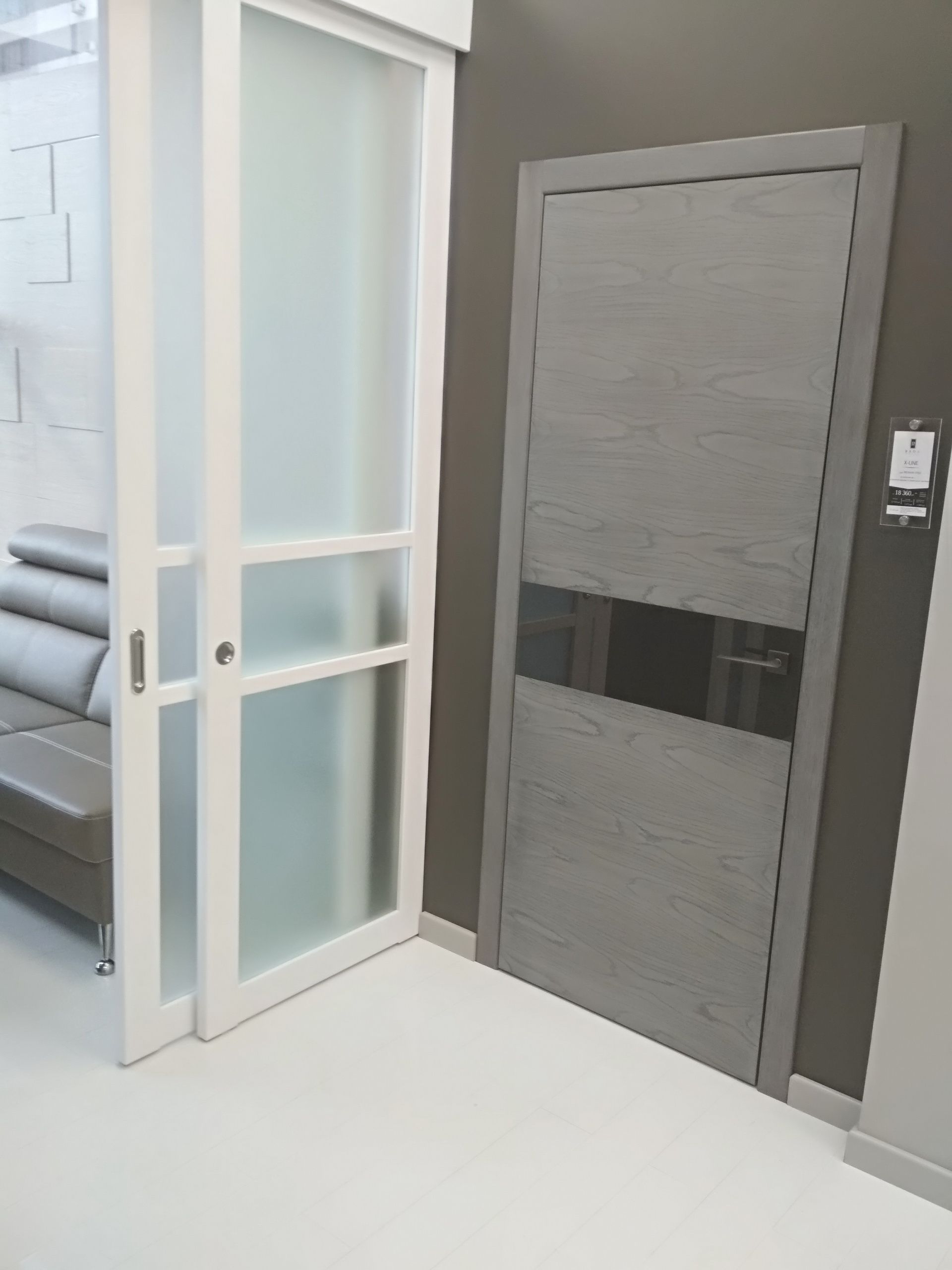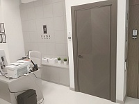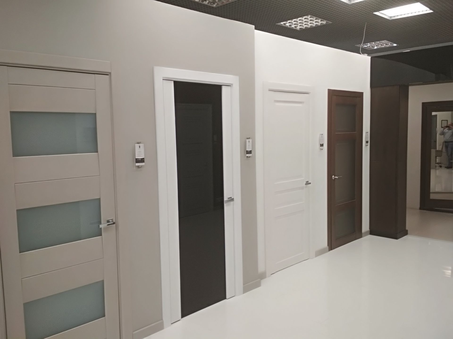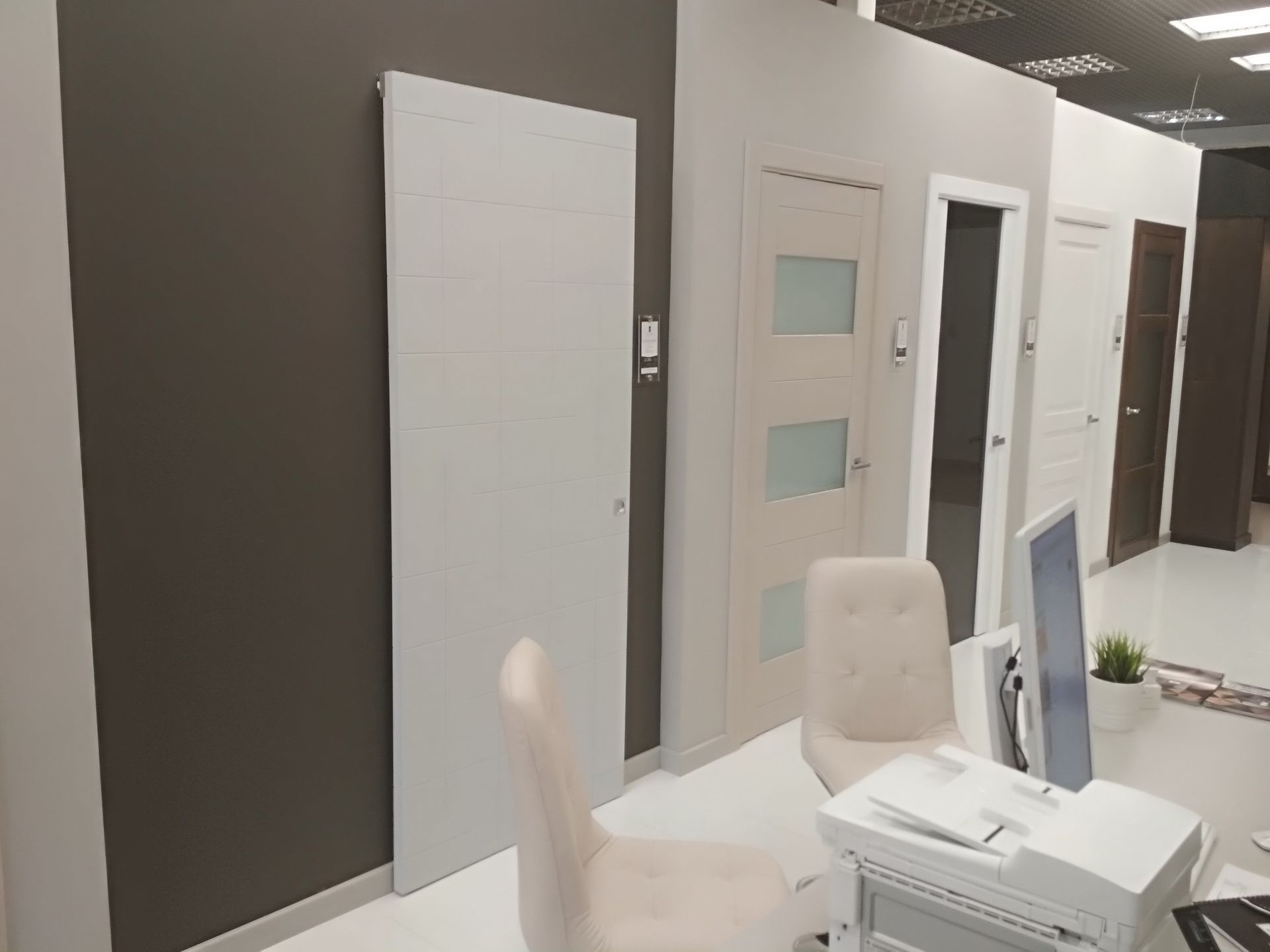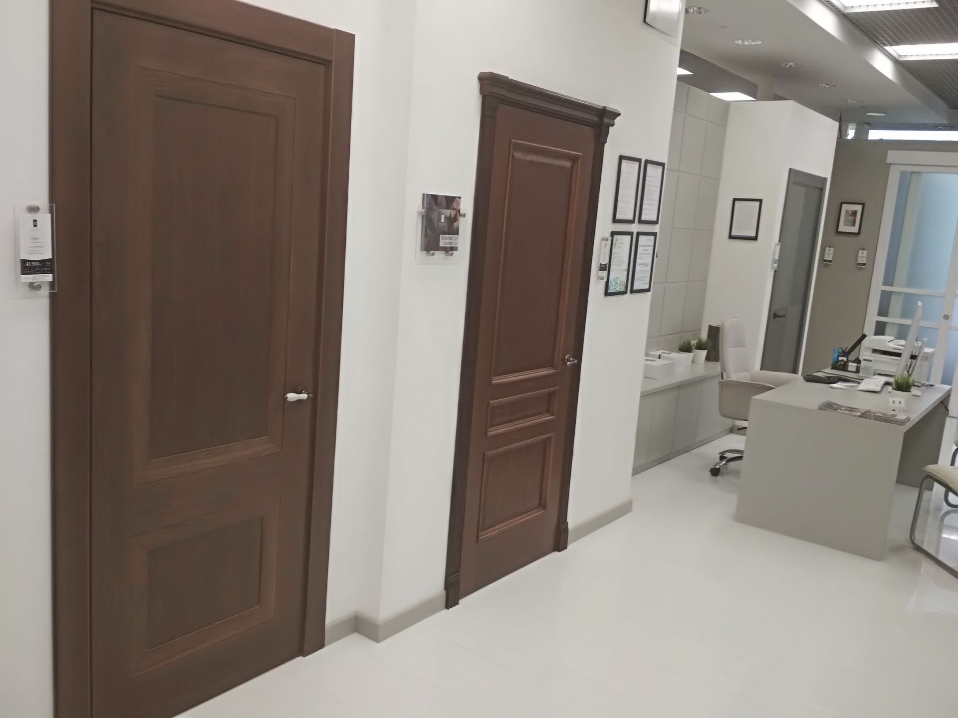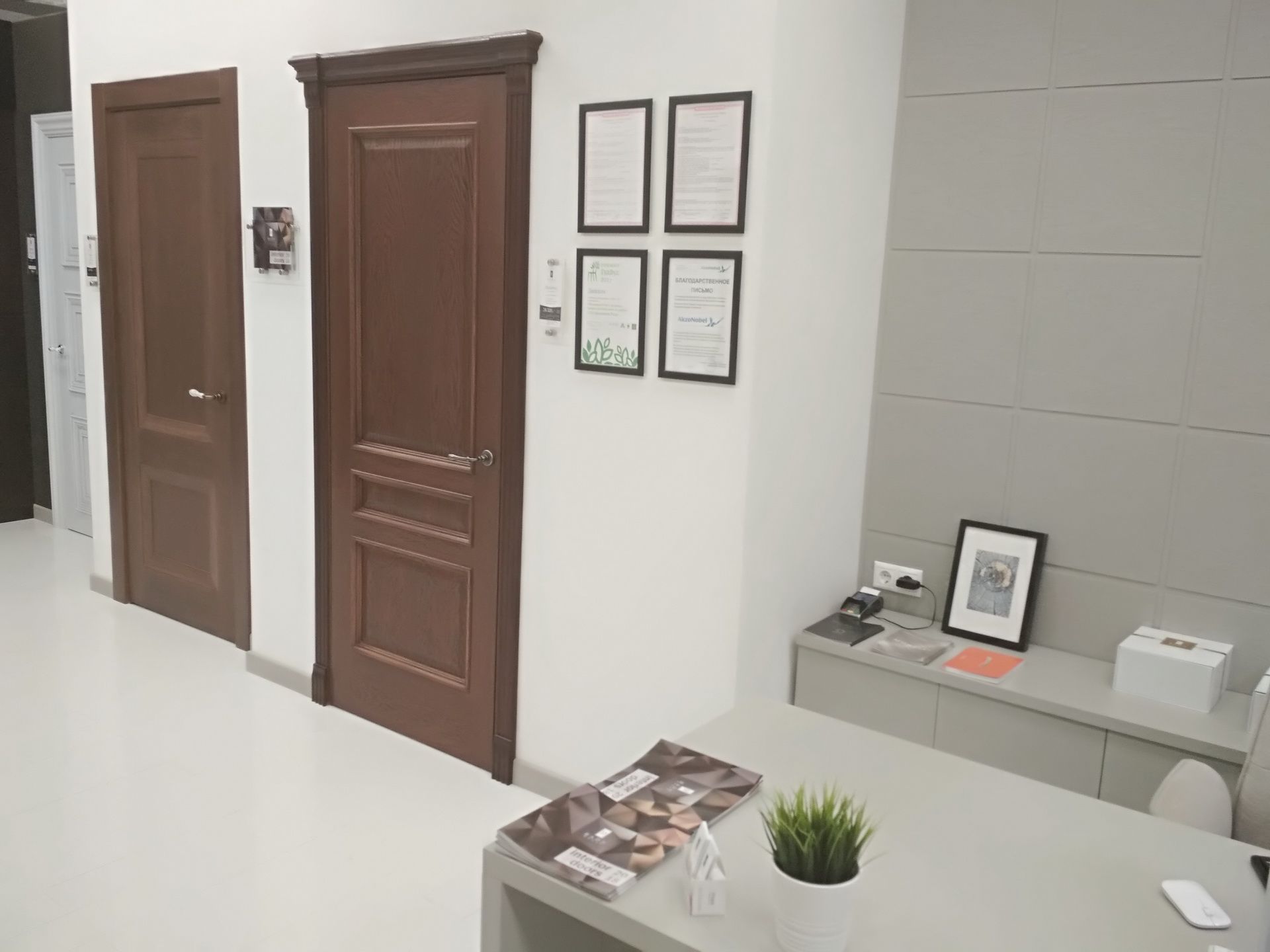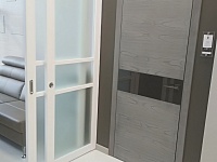 В отличие от других наших московских салонов, в новом - мы сделали акцент на «дизайнерских» цветах и дверях, отодвинув на второй план модерновую и классическую темы, оставив только новые и популярные классические модели дверей. За исключением Палермо в цвете дуб коньяк, моделей Antique в Color-05 по МДФ и ещё пары классических дверей, всё остальное пространство мы отдали под современную тему и неоклассику. Это Stone в сером дубе, Marco в карамелло, X-Line в цвете меланж грей, Meridians в Color-06 и др.
