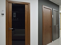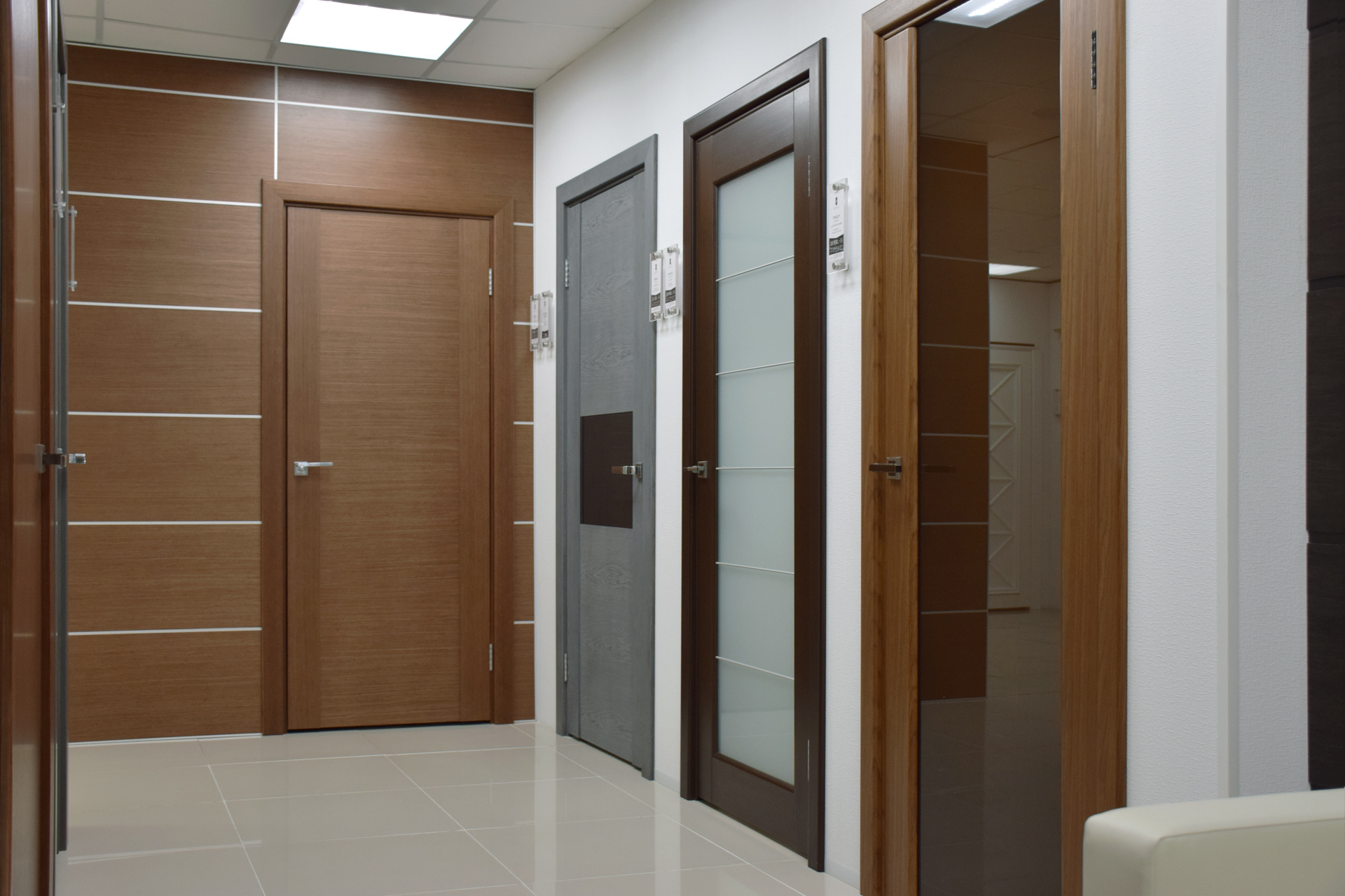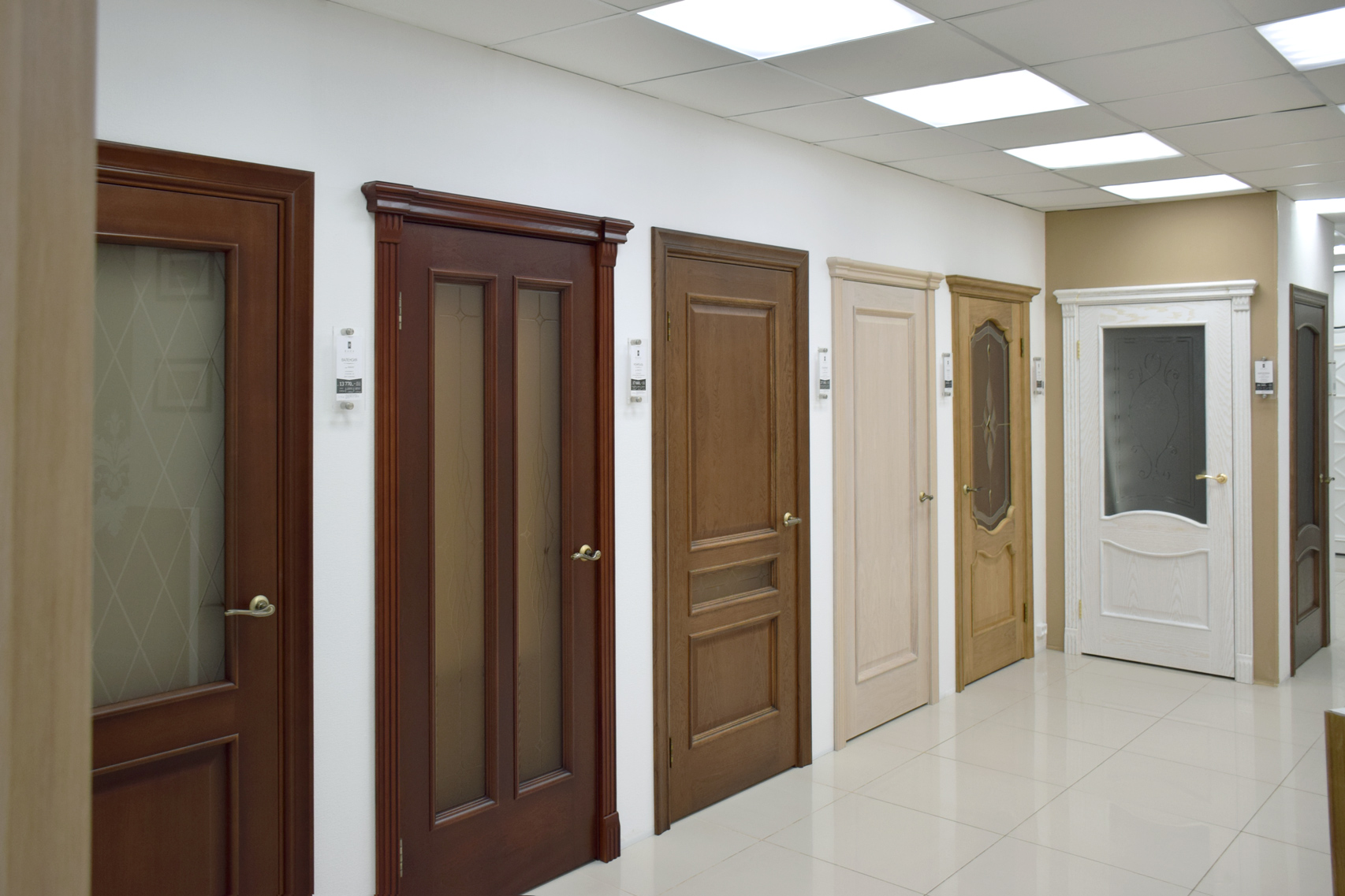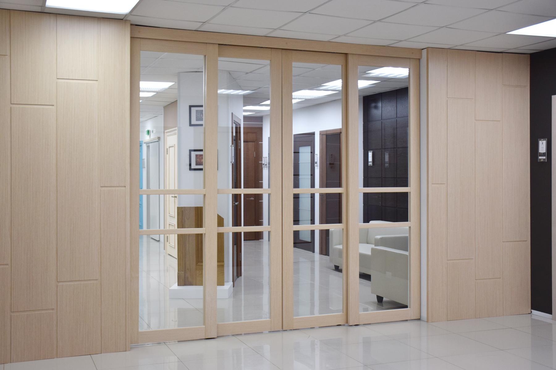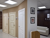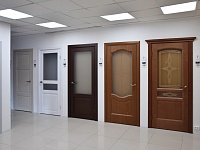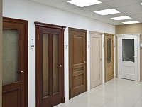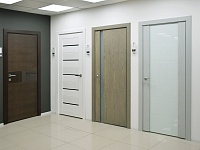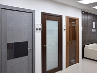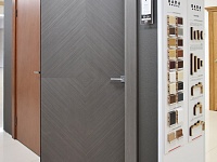 Украшение выставки – двери в новых вариантах покрытий: капучино, меланж грей и др. Дополнительно в салоне можно посмотреть варианты раздвижных перегородок, рото-двери и стеновых панелей.