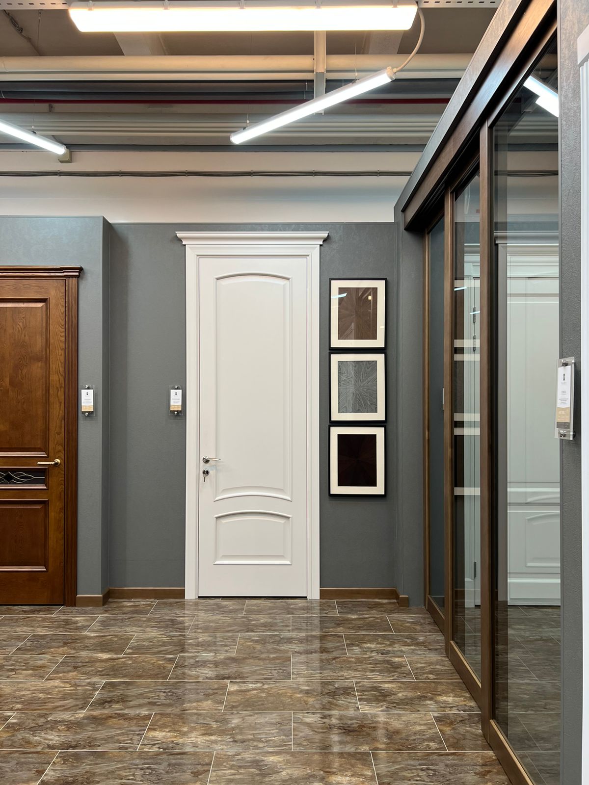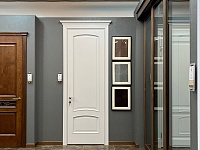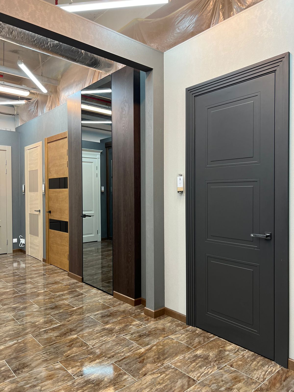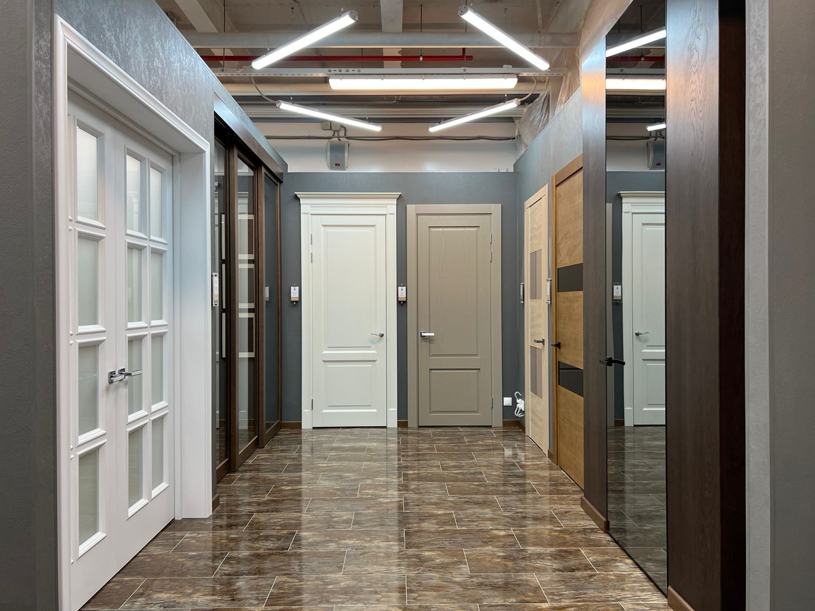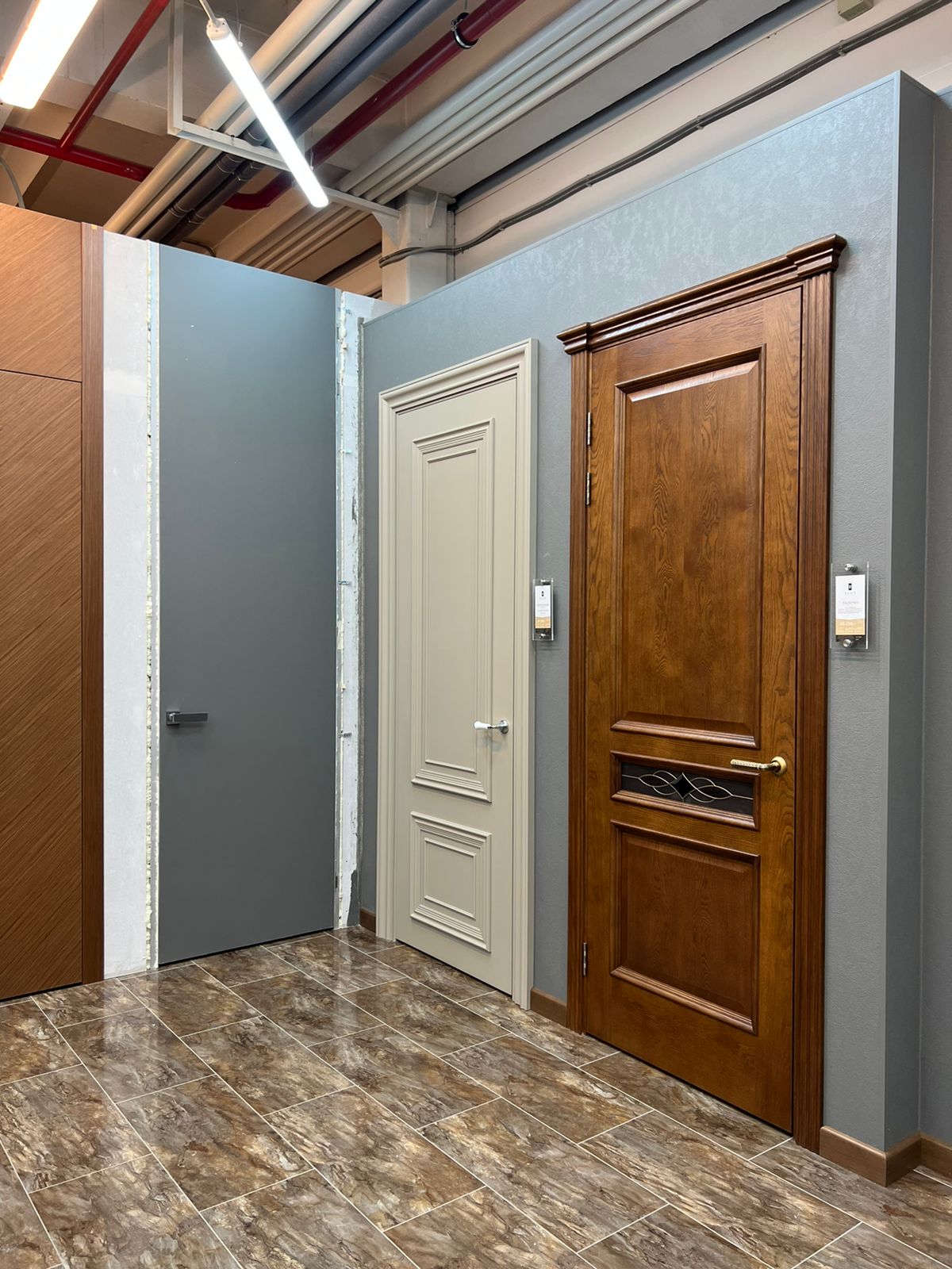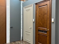 Как и на всех наших выставках, мы и здесь постарались максимально полно показать наш модельный ряд. Поэтому в новом фирменном салоне представлены как классические, так и современные модели дверей. К тому же мы постарались представить двери в различных типах покрытий: натуральном шпоне, шпоне файн-лайн, эмалях по МДФ и по шпону.