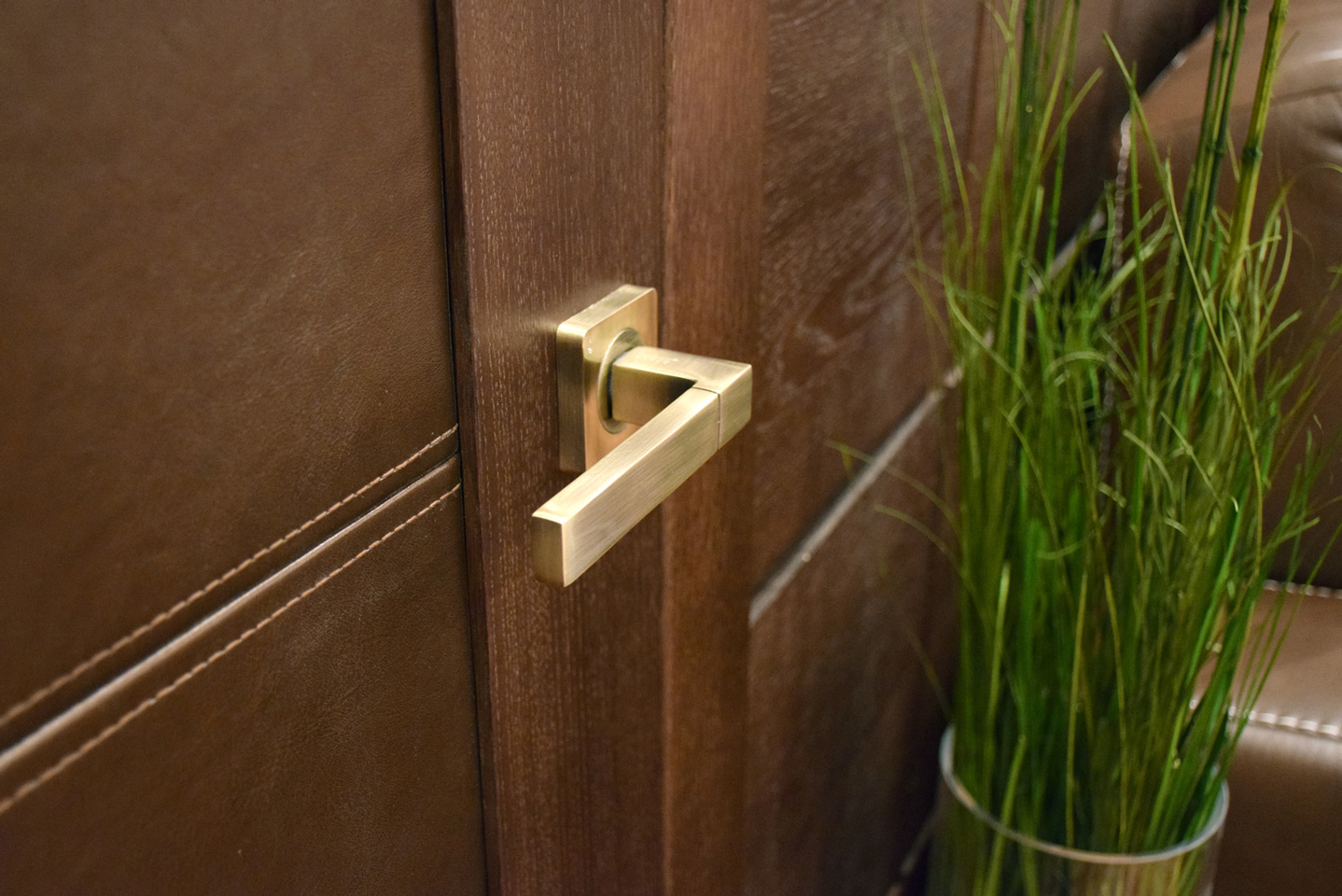 В рамках кабинетной темы был представлен проект со стеновыми панелями VOLUME в цвете "эспрессо" и межкомнатная дверь BRUNO со вставкой из натуральной кожи.