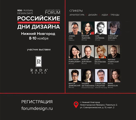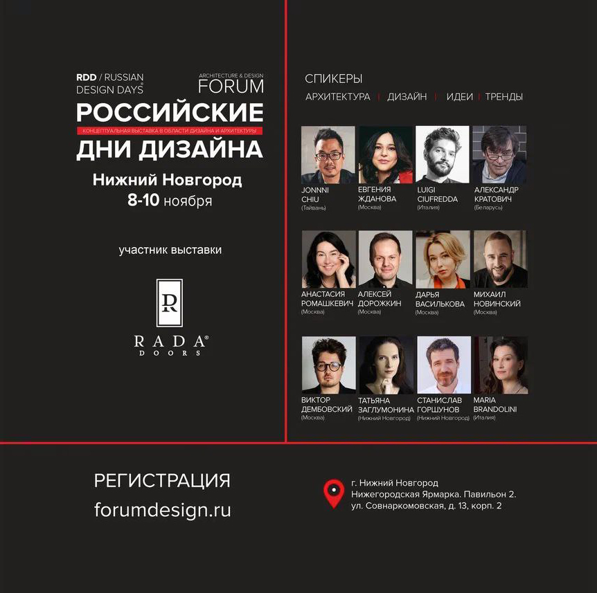 Компания Rada Doors с гордостью объявляет о своем участии на выставке "Российские дни дизайна". Мы приглашаем всех ценителей качественных дверей и уникальных решений для интерьера посетить наш стенд с 8 по 10 ноября.