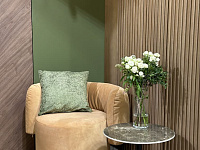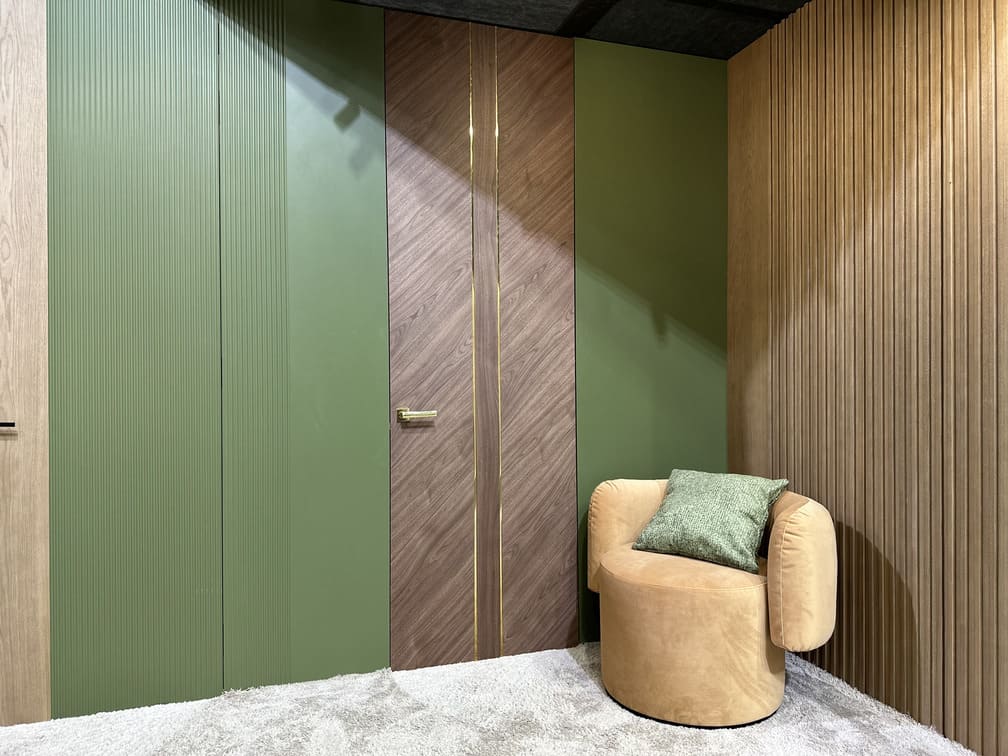 Кроме того, в экспозиции можно увидеть мягкие стеновые панели, которые не только украшают пространство, но и помогают создать уютную атмосферу с улучшенной звукоизоляцией.
