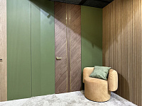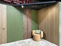 Не менее интересны стеновые панели Volume толщиной 16 мм, представленные на выставке в 2 покрытиях: в цвете S 6020-G50Y и в натуральном шпоне дуба Сахара. Особая техника сшивки mixmatch подчёркивает уникальную текстуру дерева, создавая гармоничные контрасты и оригинальные узоры. Эти панели помогут создать яркий акцент в любом интерьере, придавая ему индивидуальный характер и современный стиль.