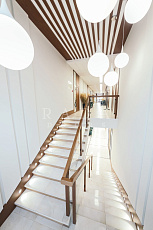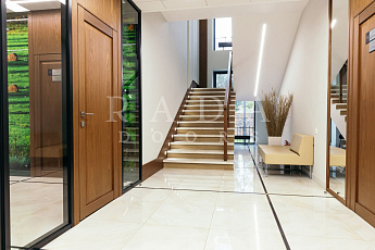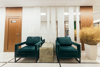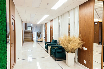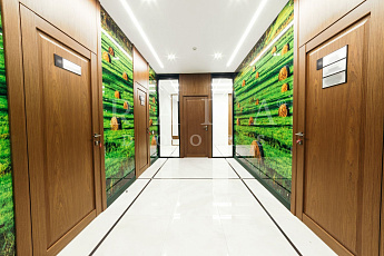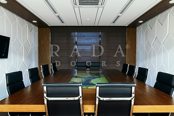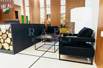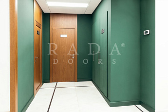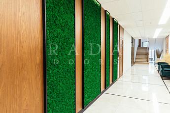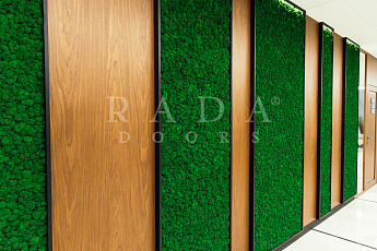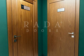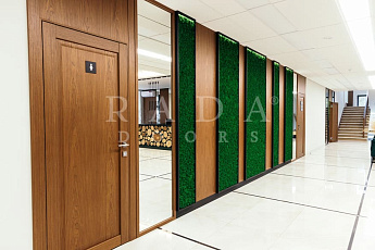 В коридорах офиса установлены двери Марко исп.1ДГ и Неоклассика исп.1 ДГ. Дверные полотна и погонаж покрыты натуральным шпоном. Врезка и монтаж фурнитуры производилась полностью на производстве Rada Doors, что позволило сократить время монтажа конструкции.