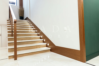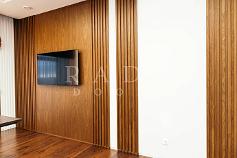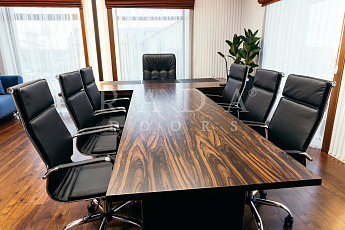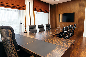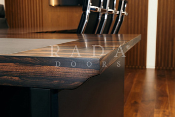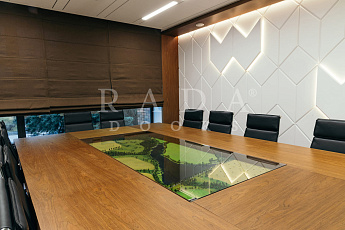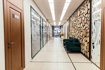 Для отделки офисов было разработано комплексное решение: двери, нестандартные стеновые панели, плинтуса, декоративный брус, оформление арочной конструкции и лестничного марша, а так же индивидуальная разработка - декоративное панно из срезов вяза.