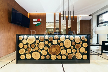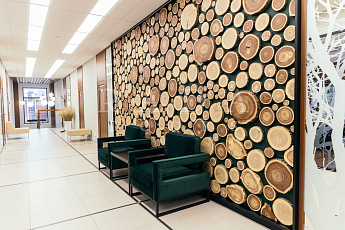 Фабрика rada Doors реализует любые, даже самые смелые дизайнерские идеи! Нестандартная разработка для проекта Агрогруппы «Хорошее дело» - панно с кольцами вяза. Мы подобрали срезы разных диаметров, оттенков и фактур. Такой яркий и необычный элемент декора отлично вписался в общую эко-стилистику.
