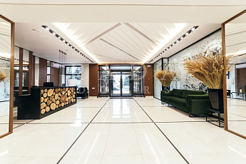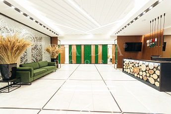 Зона ресепшен оформлена стеновыми панелями. Монтаж произведем методом «стык в стык», что позволяет создать визуально единую конструкцию без стыковочного шва. Стеновые панели чередуются с зеркальной конструкцией, рама которой выполнена из МДФ и покрыта натуральным шпоном.
