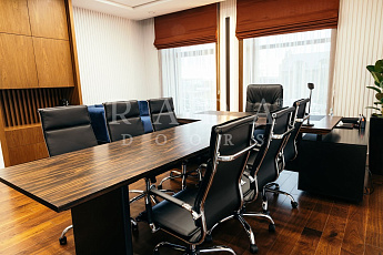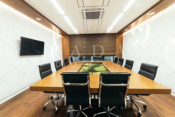Разрабатывая проект переговорной, перед нами стояла непростая задача. Необходимо было разработать индивидуальную форму стеновых панелей со встроенной подсветкой. Форма стеновой панели - колос, отражает один из основных видов деятельности компании «Хорошее дело». Для освещения нами разработана цельная композиция со встроенными светодиодными лентами, которые с помощью рассеивания света, придали стеновой панели легкость и визуальный объем.