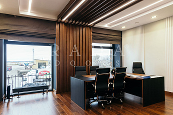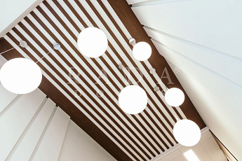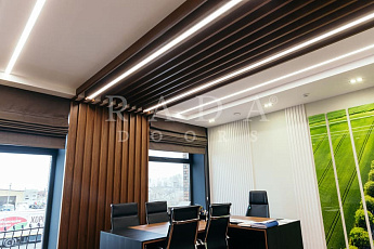 Во входной группе офиса на потолке установлен декоративный брус. Запил брусков сделан под разным углом, что делает конструкцию необычной и интересной. Сам брус покрыт эмалью матового оттенка, что придает визуальную глубину и не утяжеляет конструкцию.