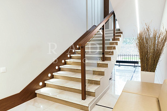 Лестничный марш - идеально спроектированная конструкция в едином стиле. Имитация плинтуса выполнена из стеновых панелей 250 мм, переходящих в колонну высотой 8 метров и единым ансамблем соединяется с декоративным брусом на потолке. Для увеличения срока службы перила покрыты 3 слоями износостойкого лака.