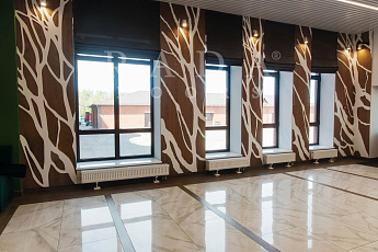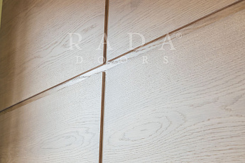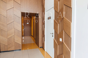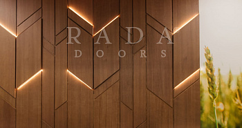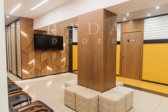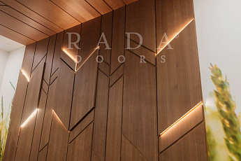 4. В холле мы установили объемные шпонированные панели в форме колоса, а встроенная подсветка придала конструкции объем.