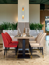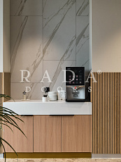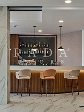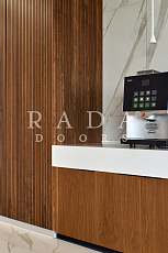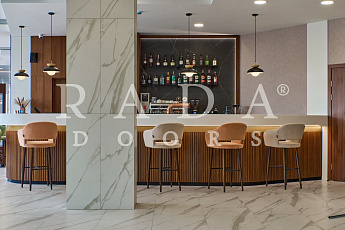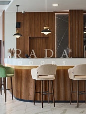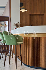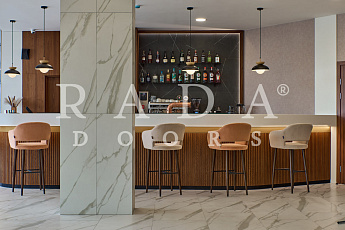 - Стеновые панели Volume с фрезеровкой использованы на фасаде барной стойки и на панелях за баром. Задают ритм и подчёркивают единство стиля;