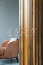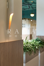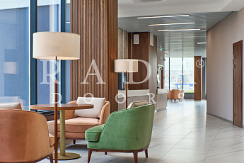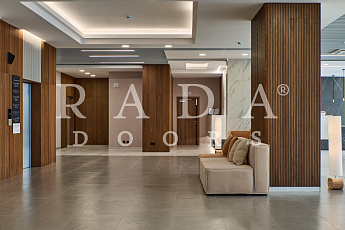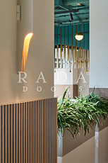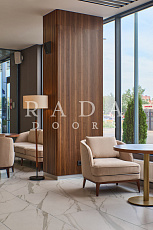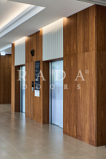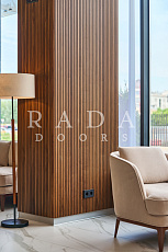 - Стеновые панели Volume в шпоне американский орех и с покрытием матовой эмалью обрамляют лифтовые порталы и акцентную стену за стойкой ресепшен;