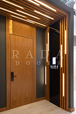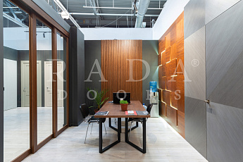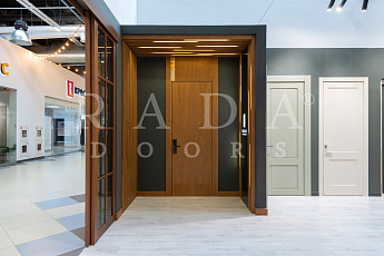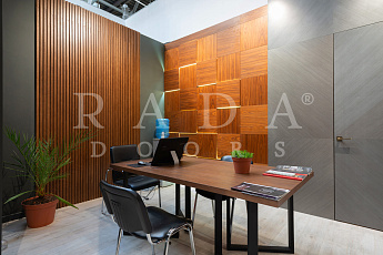 Также на выставке представлена проектная противопожарная дверь ДПГ с электронным замком, отбойной пластиной и автопорогом. Врезка электронного замка производилась на нашей фабрике на собственном высокоточном оборудовании. Над проектной дверью установлен подвесной реечный потолок с подсветкой, которая создает атмосферу уюта в интерьере.