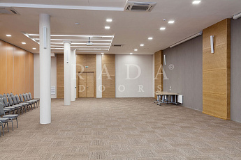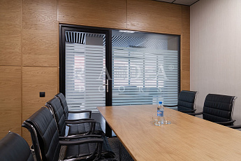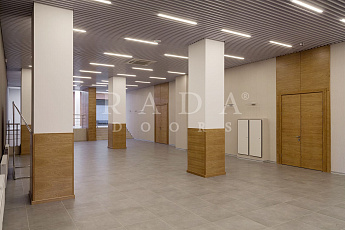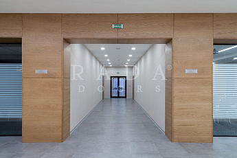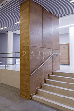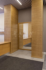 Холл, коридоры, переговорные комнаты - всего более 500 кв.м. Стеновые панели Volume изготовлены в покрытии из натурального шпона с повышенной звукоизоляцией по просьбе заказчика. Панели изготовлены из экологически чистых материалов, поэтому безопасны для здоровья. Особая технология изготовления панелей делает их прочными и устойчивыми к внешним воздействиям.