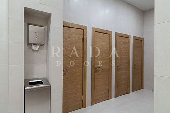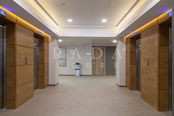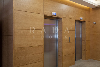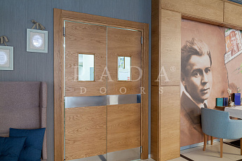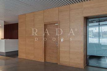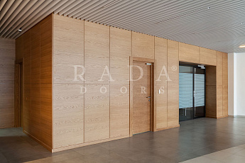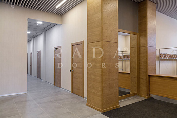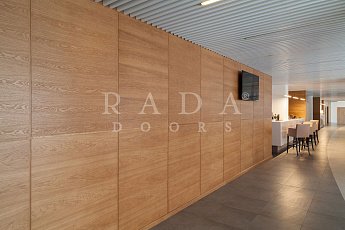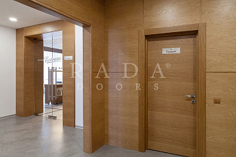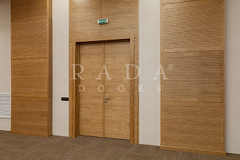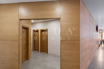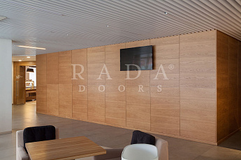 Дверные полотна Марко исп.1 ДГ отлично влились в общую стилистику отеля. Двери, как и стеновые панели, изготовлены в покрытии из натурального шпона. Врезка и монтаж фурнитуры производилась полностью на производстве Rada Doors, что позволило сократить время монтажа конструкции. Для дверей в номерах гостиницы сделана врезка под электронный замок.