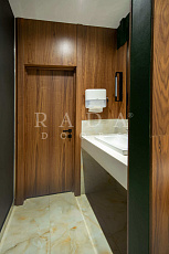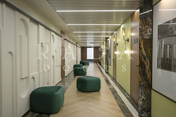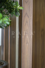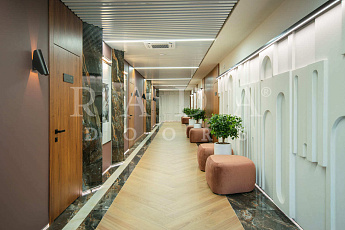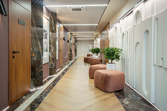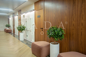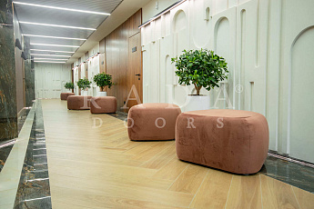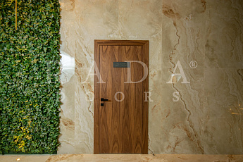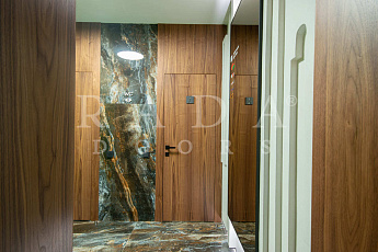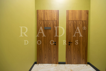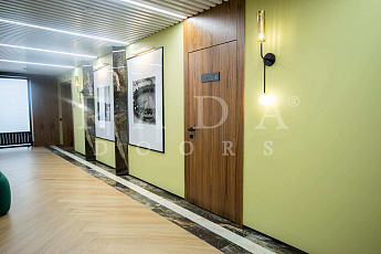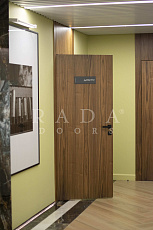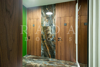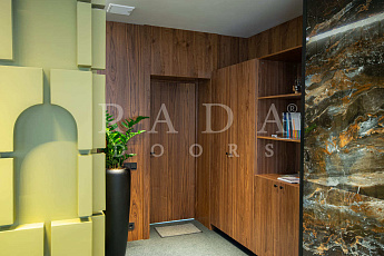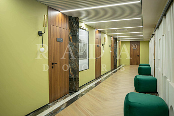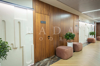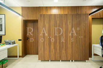 Для увеличения визуальной высоты потолка в коридорах и кабинетах были установлены дверные полотна Марко с фальш фрамугой в покрытии Американский орех с вертикальной сшивкой шпона.