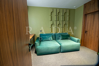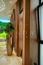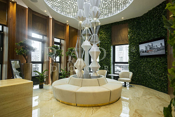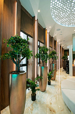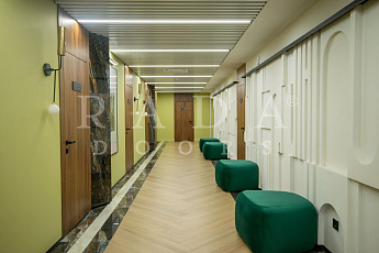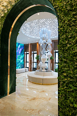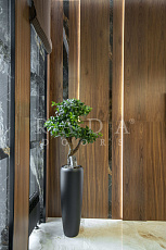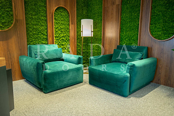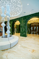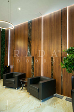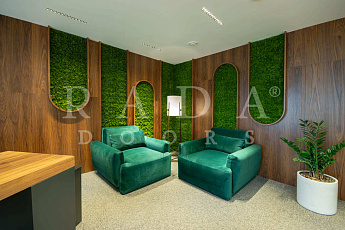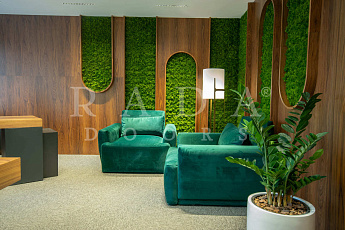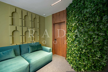 В рамках этого проекта мы также осуществили отделку стен панелями Volume по индивидуальным размерам и разработали уникальные формы стеновых панелей в виде арок с искусственной зеленью внутри.