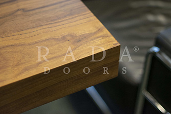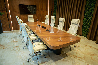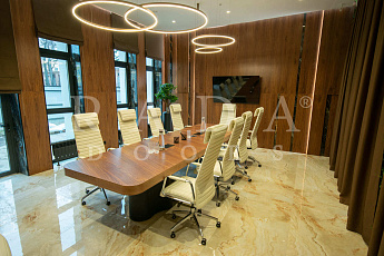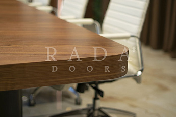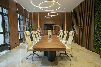 Для дополнительного великолепия переговорной комнаты наша компания изготовила стол из натурального шпона Американского ореха без тонировки с толщиной столешницы 10 см!