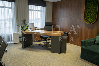В кабинетах и коридорах офиса теперь великолепно смотрятся двери Марко исп. 1 ДГ из натурального шпона Американского ореха. Комплект дверей включает в себя компланарные наличники, создающие впечатление единого плоского пространства, что придает интерьеру современный стиль и элегантность.